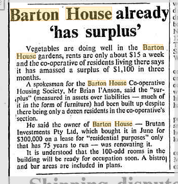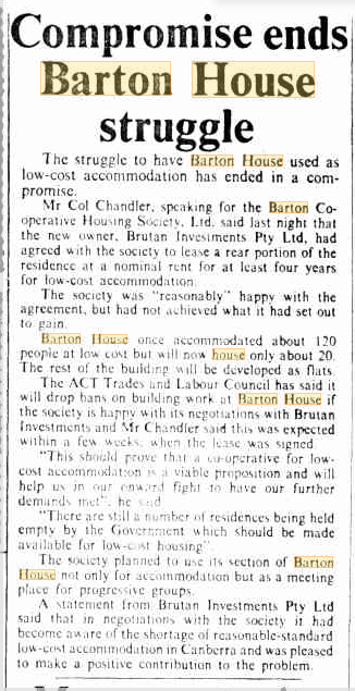 Mr Col Chandler, speaking for the Barton Co-operative Housing Socicty Ltd, said last night that the new owner, Brutan Investments Pty Ltd, had agreed with the socicty to lease a rear portion of the residence at a nominal rent for at least four years for low-cost accommodation. The society was "reasonably" happy with the agreement, but had not achieved what it had set out to gain. Barton House once accommodated about 120 people at low cost but will now house only about 20. The rest of the building will be developed as flats. The ACT Trades and Labour Council has said it will drop bans on building work at Barton House if the socicty is happy with its negotiations with Brutan Investments and Mr Chandler said this was expected within a few weeks, when the lease was signed. "This should prove that a co-opcrative for low cost accommodation is a viable proposition and will help us in our onward fight to have our further demands met", he said. "There arc still a number of residences being held empty by the Government which should be made available for low-cost housing". The society planned to use its section of Barton House not only for accommodation but as a meeting place for progressive groups. A statement from Brutan Investments Ply Ltd said that in negotiations with the socicty it had bccomc aware of the shortage of reasonable-standard low-cost accommodation in Canberra and was pleased to make a positive contribution to the problem.
