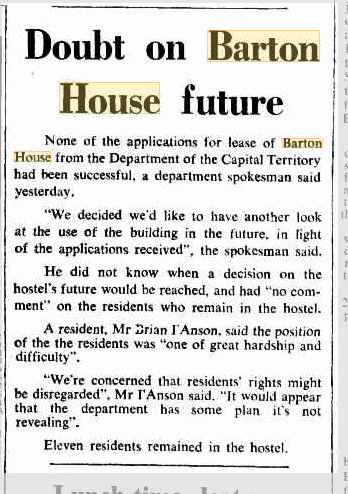 Mr Justice Connor was hearing applications for in junctions by 12 people who sought to restore their posi tions and possessions at Barton House to the same condition before the Commonwealth and Mr G. S. Cameron, the former lessee, entered the 'building yesterday morning. They also sought to restrain them from assault, in-, timidation, imprisonment and interference against the resi dents in respect to their occu pation of Barton House. Counsel for the plaintiffs, Mr Terry Higgins, said that Mr Cameron, officers from the Department of the Capital Territory, and the ACT Police had' entered Barton House about 9.30am yesterday and had, by intimidation and a show of force, ejected the resi dents. Some residents had left without their belongings. Mr Higgins said this had happened during a time when the plaintiffs had been seeking to intervene in an application before Canberra Petty Sessions in which the question of their rights to occupy Barton House would be decided. The action was to have been heard on October 12 but would now be discontinued. One of the plaintiffs, Mr Josef Titan, told the court he had lived at Barton House for about eight months. A notice informing the residents that they had to move out of Bar ton House by June 30 had been put on a noticeboard abbut a month before that date. Mr Titan said he had moved out on June 30 but had returned three weeks later. After June 30, some residents had formed a registered co-operative to provide services including electricity, heating and telephones. Mr Titan said that he had been told on a number of occasions by another plaintiff, Mr Brian I'Anson, that the co-operative had had the same chance to obtain the lease for Barton House as everyone else. Furniture arrangement Mr Cameron told the court that on Monday an arrangement had been made to lease his furniture and fittings at the building to the Commonwealth for one month. He said he had had no dealings with the residents yesterday morning. No rent had been paid after June 30 but as a gesture he had suggested the co-operative give the Salvation Army $20 each week in order to keep using his furniture and fittings. He agreed with Mr Higgins that the purpose of the arrangement with the Commonwealth last Monday had been to give the Commonwealth an interest in the furniture and fittings. Accommodation elsewhere Mr Reg Hiscock, for the Commonwealth, told Mr Justice Connor that while the goods owned by Mr Cameron had been at Barton House Mr Cameron had not technically left the premises vacant for the landlord. The Commonwealth had arranged for the people still living at Barton House to live at Ainslic Hostel. Mr Hiscock submitted that there was only one inference to be drawn, and that was that the plaintiffs were trespassers and had no rights to live at Barton House. 'Unsatisfactory' alternative Mr Bernard Cairns, for Mr Cameron, submitted that it would not be possible for an injunction to go against Mr Cameron as his rights at Barton House had expired. There was no evidence that Mr Cameron had in any way interfered, intimidated, assaulted or imprisoned the residents, he said. Mr Higgins submitted that Mr Cameron had entered a collusive arrangement with the Commonwealth in respect to the furniture and fittings. He said Ainslie Hostel had been a totally unsatisfactory alternative and his clients should be allowed to occupy Barton House for at least a short term. Mr Justice Connor said it was a classical case of boarders or lodgers. There was no basis for treating it as 'a contract of letting' as the Landlord and Tenants Ordinance indicated, he said. An application for damages for 'trespass, assault and false imprisonment' might proceed and so he would say little about the merits of the matter. On the evidence before him, he could not see how a right legally existed for the plaintiffs to stay at Barton House. He reserved costs and noted that alternative accommodation had been found for the residents and that arrangements would be made for the collection of their belongings from Barton House.
