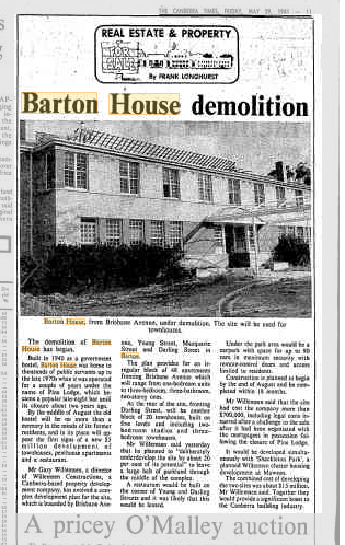 Built in 1940 as a government hostel, Barton House was home to thousands of public servants up to the late 1970s when it was operated for a couple of years under the name of Pine Lodge, which became a popular late-night bar until its closure about two years ago. By the middle of August the old hostel will be no more than a memory in the minds of its former residents, and in its place will appear the first signs of a new $5 million development of townhouses, penthouse apartments and a restaurant. Mr Gary Willemsen, a director of Willemsen Constructions, a Canberra-based property development company, has evolved a complex development plan for the site, which is bounded by Brisbane Avenue, Young Street, Macquarie Street and Darling Street in Barton. The plan provides for an irregular block of 48 apartments fronting Brisbane Avenue which will range from one-bedroom units to three-bedroom, three-bathroom, two-storey ones. At the rear of the site, fronting Darling Street, will be another block of 20 townhouses, built on five levels and including two bedroom studios and three bedroom townhouses. Mr Willemsen said yesterday that he planned to "deliberately underdevelop the site by about 20 per cent of its potential" to leave a large belt of parkland through the middle of the complex. A restaurant would be built on the corner of Young and Darling Streets and it was likely that this would be leased. Under the park area would be a carpark with space for up to 90 cars in maximum security with remote-control doors and access limited to residents. Construction is planned to begin by the end of August and be completed within 18 months. Mr Willemsen said that the site had cost the company more than $700,000, including legal costs incurred after a challenge to the sale after it had been negotiated with the mortgagees in possession following the closure of Pine Lodge. It would be developed simultaneously with 'Shackleton Park', a planned Willemsen cluster housing development at Mawson. The combined cost of developing the two sites was about S15 million, Mr Willemsen said. Together they would provide a significant boost to the Canberra building industry.