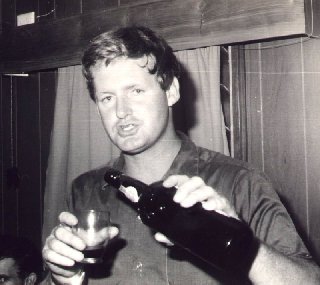 | The "Old Boozer" at Pan Flat. From left to right: Chris Reddel, Ian (Sarge) Williams, Tony Cowell, Graeme Wellington. Taken late '67. | Ross Henderson, the local kiap. Now lives in northern Tasmania, Australia, and consults to the timber industry (talking to the trees?). |