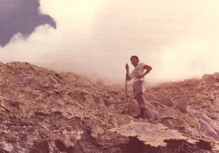 | Graeme and Gill Wellington with Ian and Annie Smith at Kawerong House function. It was the same night during the dinner that someone bent over and bit Anne Blackwell (Mine Manager's wife) on the bum as she was serving food! Good career move! | Graeme Wellington in one of the lesser active craters. The photographer was even further down in the crater (when last seen!). |