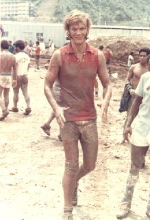 | Ross Jones (?), Graeme Wellington, John Eccles on top of Mount Balbi volcano, Easter 1973 | Mike Edmeades (industrial psychologist before Lanse Taudevin) after a footy match at Panguna - circa 1973 - still holding the ball! |