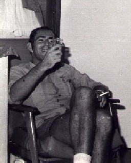 | Ern Mitchell, Community Relations Officer with BCL (here maintaining a close relationship with a bottle) | George Johnson with Ken Nelson in background at Barapinang Stores, late '67. |