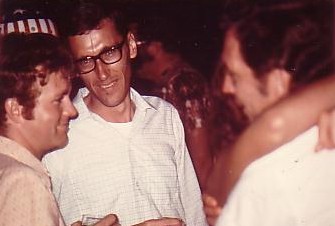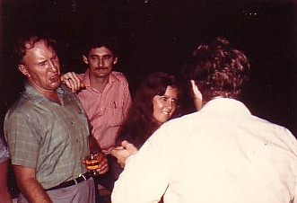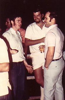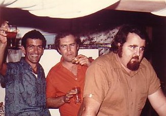 | "Bulldog" Malcolm Baker (in red shirt) in his element; is Chris Maxwell thinking of all the money he has spent on booze? The chap in the blue shirt is George Loucaides | The always debonair "Goldfinger" - the only man with two dongas: one for himself, one for his ham radio (by the looks he ought have had a third one for his girls!) | |
