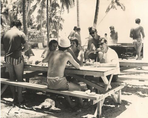 Des Hudson (sitting on top of table), Peter Goerman (white tee-shirt)