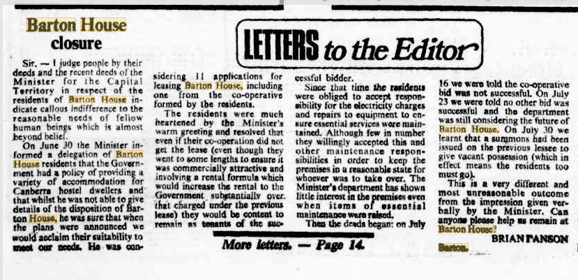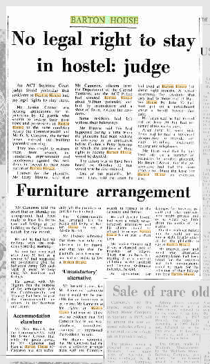 Mr Justice Connor was hearing applications for in junctions by 12 people who sought to restore their posi tions and possessions at Barton House to the same condition before the Commonwealth and Mr G. S. Cameron, the former lessee, entered the 'building yesterday morning. They also sought to restrain them from assault, in-, timidation, imprisonment and interference against the resi dents in respect to their occu pation of Barton House. Counsel for the plaintiffs, Mr Terry Higgins, said that Mr Cameron, officers from the Department of the Capital Territory, and the ACT Police had' entered Barton House about 9.30am yesterday and had, by intimidation and a show of force, ejected the resi dents. Some residents had left without their belongings. Mr Higgins said this had happened during a time when the plaintiffs had been seeking to intervene in an application before Canberra Petty Sessions in which the question of their rights to occupy Barton House would be decided. The action was to have been heard on October 12 but would now be discontinued. One of the plaintiffs, Mr Josef Titan, told the court he had lived at Barton House for about eight months. A notice informing the residents that they had to move out of Bar ton House by June 30 had been put on a noticeboard abbut a month before that date. Mr Titan said he had moved out on June 30 but had returned three weeks later. After June 30, some residents had formed a registered co-operative to provide services including electricity, heating and telephones. Mr Titan said that he had been told on a number of occasions by another plaintiff, Mr Brian I'Anson, that the co-operative had had the same chance to obtain the lease for Barton House as everyone else. Furniture arrangement Mr Cameron told the court that on Monday an arrangement had been made to lease his furniture and fittings at the building to the Commonwealth for one month. He said he had had no dealings with the residents yesterday morning. No rent had been paid after June 30 but as a gesture he had suggested the co-operative give the Salvation Army $20 each week in order to keep using his furniture and fittings. He agreed with Mr Higgins that the purpose of the arrangement with the Commonwealth last Monday had been to give the Commonwealth an interest in the furniture and fittings. Accommodation elsewhere Mr Reg Hiscock, for the Commonwealth, told Mr Justice Connor that while the goods owned by Mr Cameron had been at Barton House Mr Cameron had not technically left the premises vacant for the landlord. The Commonwealth had arranged for the people still living at Barton House to live at Ainslic Hostel. Mr Hiscock submitted that there was only one inference to be drawn, and that was that the plaintiffs were trespassers and had no rights to live at Barton House. 'Unsatisfactory' alternative Mr Bernard Cairns, for Mr Cameron, submitted that it would not be possible for an injunction to go against Mr Cameron as his rights at Barton House had expired. There was no evidence that Mr Cameron had in any way interfered, intimidated, assaulted or imprisoned the residents, he said. Mr Higgins submitted that Mr Cameron had entered a collusive arrangement with the Commonwealth in respect to the furniture and fittings. He said Ainslie Hostel had been a totally unsatisfactory alternative and his clients should be allowed to occupy Barton House for at least a short term. Mr Justice Connor said it was a classical case of boarders or lodgers. There was no basis for treating it as 'a contract of letting' as the Landlord and Tenants Ordinance indicated, he said. An application for damages for 'trespass, assault and false imprisonment' might proceed and so he would say little about the merits of the matter. On the evidence before him, he could not see how a right legally existed for the plaintiffs to stay at Barton House. He reserved costs and noted that alternative accommodation had been found for the residents and that arrangements would be made for the collection of their belongings from Barton House.