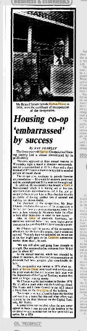 Members approved at their annual meeting on Wednesday night a board of directors recommendation for a cash dividend of 12.5c a share and a share dividend of 87.5 cents a share to be applied to uncalled portion of issued shares. The co-operative continues to provide low-cost accommodation — $8 a week for students, pensioners and the unemployed and $ 15 a week for the employed, In addition, the co-operative has bought a house at Narrabundah which it is leasing out as low-cost, apartment-type accommodation and it has just arranged to lease another house in Narrabundah with the possibility of leasing another two if demand and viability are demonstrated. The chairman of the co-operative, Mr Brian I'Anson, attributes the success of the co-operative to the fact that there are no direct managerial costs. This work is done voluntarily. Residents make the effort to look after themselves in order to save money. Also, in times of economic downturns, cooperatives survived better than more highly-geared institutions because they did not have to make a profit. Mr I'Anson said the success of the co-operative effectively put the lie to the sceptics that it would not succeed. "Not only have we succeeded but we are one of the few bright spots in the Canberra commercial market these days", he said. "We are still alive and going from strength to strength. Our membership has increased from 50 last year to about 80". At the annual meeting, which was attended by about 25 members, the directors' recommendation on dividends had been accepted after considerable debate. The co-operative was formed in 1976 when residents of Barton House were faced with eviction after the proprietors decided not to renew their lease with the Department of the Capital Territory because they were no longer making money. Mr I'Anson was the last resident in October 1976. He left after a court order and the hostel was closed. The Trades and Labour Council in the ACT placed a black ban on the demolition of the building. The co-operative had offered to lease the building and run it as a hostel but this and other offers were rejected by the then Minister for the Capital Territory, Mr Staley. A compromise was reached when the new owner agreed to lease a rear portion of the building to the co-operative at a nominal rent for four years with an option for a fifth.
