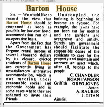 It was 1965. The Menzies era was coming to an end. The conflict in Vietnam was escalating. And I had just come out to Australia as a young migrant from Germany. I spent those early years, from 1965 to 1967, and then again a brief period in 1969 after I had come back from South Africa, in Canberra in a place called "Barton House" in Brisbane Avenue, one of the many boarding houses then in existence.